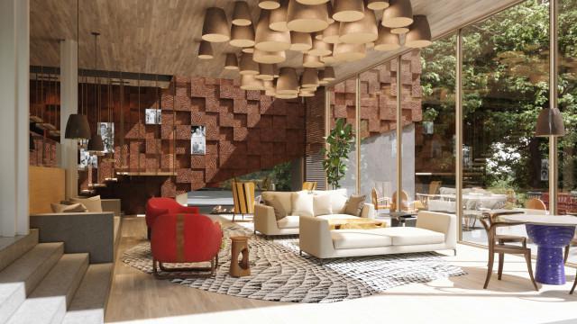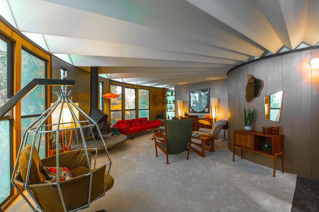 Under its zigzag roofline, nearly every vertical surface in this 1967 house curves to form a circle. The windows curve. The paneled hallways curve. The front doors (there are two) curve. “When you close a door, you see a continuous round wall,” says Julian Goldklang, who with his wife, Desiree, have turned the house — and to a degree themselves — into an ode to midcentury design. “Most people don’t get their dream home to be their